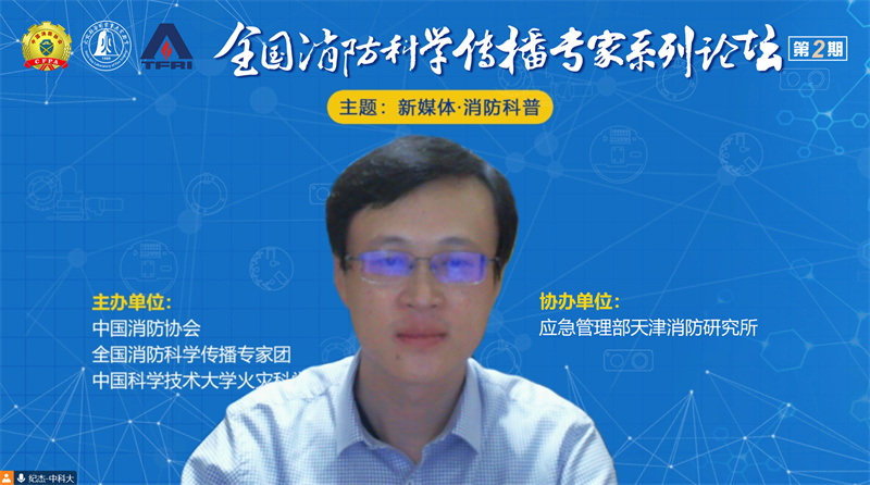 11月27日,由中國消防協(xié)會(huì )聯(lián)合中國科學(xué)技術(shù)大學(xué)火災科學(xué)國家重點(diǎn)實(shí)驗室(以下簡(jiǎn)稱(chēng)“火災實(shí)驗室”)共同主辦、應急管理部天津消防研究所協(xié)辦的“全國消防科學(xué)傳播專(zhuān)家系列論壇第二期——新媒體?消防科普”(以下簡(jiǎn)稱(chēng)“論壇”)成功舉行。來(lái)自消防救援隊伍、科研院所、高校、消防企業(yè)等單位的8位專(zhuān)家學(xué)者出席會(huì )議并作報告。論壇主席為中國消防協(xié)會(huì )科普教育委員會(huì )副主任李進(jìn)、火災實(shí)驗室副主任紀杰教授和應急管理部天津消防研究所科技處處長(cháng)李晉研究員。李進(jìn)及李晉研究員分階段主持會(huì )議。論壇以線(xiàn)上方式進(jìn)行,同時(shí)在光明網(wǎng)、科普中國、抖音、知乎、蔻享學(xué)術(shù)、嗶哩嗶哩等平臺直播。
