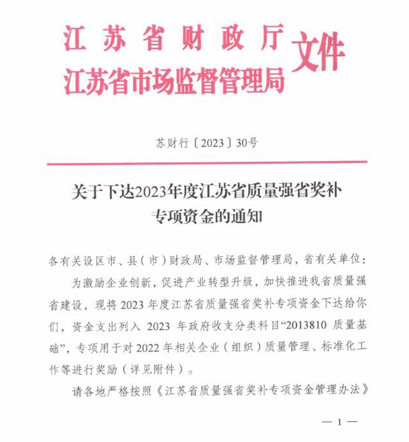近日,江蘇省財政廳、江蘇省市場(chǎng)監管局聯(lián)合下發(fā)了《關(guān)于下達2023年度江蘇省質(zhì)量強省獎補專(zhuān)項資金的通知》,協(xié)會(huì )在制定江蘇省團體標準工作方面表現突出,獲評江蘇省質(zhì)量強省獎,獎補專(zhuān)項資金拾萬(wàn)元,也是協(xié)會(huì )換屆以來(lái)連續兩年榮獲該獎項。