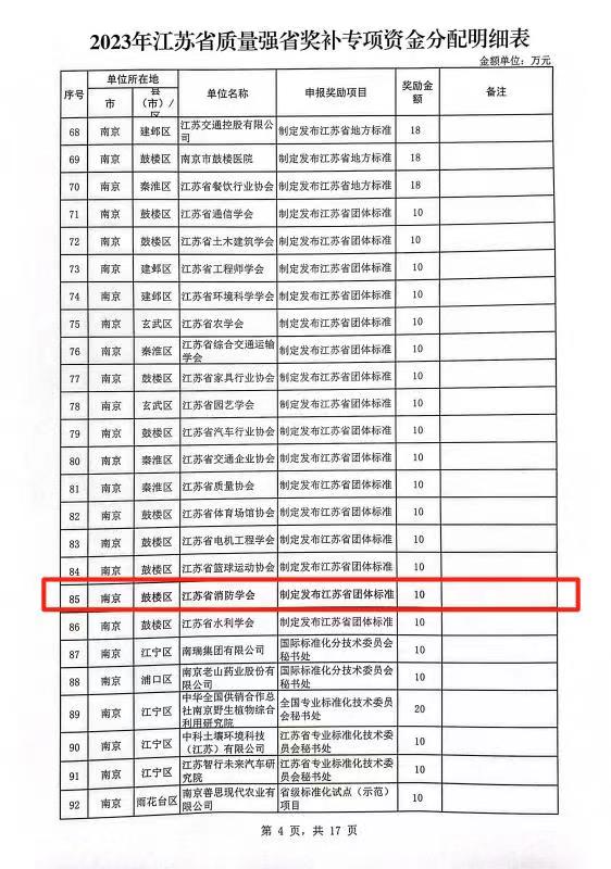 江蘇省質(zhì)量強省獎補專(zhuān)項資金是由省級財政預算安排,是為了激勵企業(yè)創(chuàng )新,促進(jìn)產(chǎn)業(yè)轉型升級,加快推進(jìn)我省質(zhì)量強省建設的專(zhuān)項資金,主要用于對質(zhì)量管理、標準化工作的獎補。一直以來(lái),協(xié)會(huì )在省消防救援總隊的指導下,在省民政廳、省科協(xié)的關(guān)心支持下,圍繞服務(wù)消防救援中心工作,引領(lǐng)消防行業(yè)創(chuàng )新升級,加強行業(yè)自律管理,結合行業(yè)產(chǎn)業(yè)發(fā)展和會(huì )員單位實(shí)際需要,扎實(shí)開(kāi)展團體標準制定工作。協(xié)會(huì )成立了團體標準委員會(huì )、專(zhuān)家委員會(huì )、電氣防火專(zhuān)業(yè)委員會(huì )、城市地下空間和軌道交通消防安全專(zhuān)業(yè)委員會(huì )等專(zhuān)門(mén)機構,印發(fā)了《江蘇省消防協(xié)會(huì )團體標準管理辦法(試行)》,為標準制定工作提供理論支持和技術(shù)支撐。先后制定發(fā)布了《消防技術(shù)服務(wù)機構能力評價(jià)》《大型換流變泡沫加強型水噴霧滅火系統技術(shù)規范》《社會(huì )單位火災防控能力評估導則》等多部團體標準,得到了社會(huì )面和業(yè)內企業(yè)的高度認可和廣泛應用,有效推動(dòng)我省消防行業(yè)產(chǎn)業(yè)發(fā)展。下一步,協(xié)會(huì )將調查研究的基礎上,著(zhù)眼行業(yè)發(fā)展的痛點(diǎn)以及制約產(chǎn)業(yè)轉型升級的難點(diǎn),有針對性的組織標準化活動(dòng),以高質(zhì)量標準化工作服務(wù)消防行業(yè)產(chǎn)業(yè)高質(zhì)量發(fā)展。