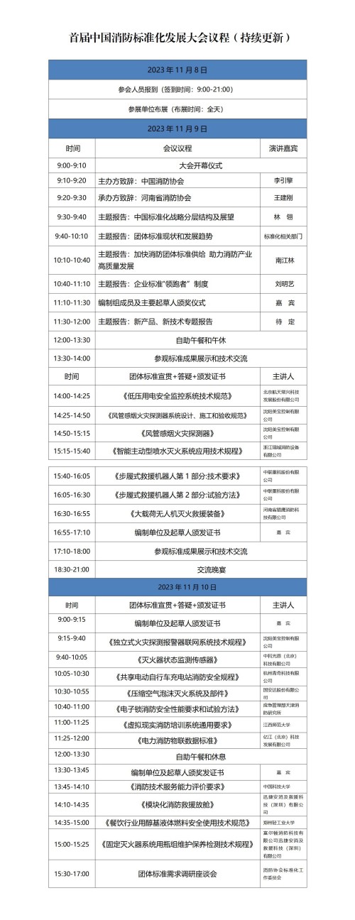 由中國消防協(xié)會(huì )主辦,河南省消防協(xié)會(huì )承辦“首屆消防標準化發(fā)展大會(huì )”將于2023年11月9日-10日在河南省鄭州市紫荊山賓館召開(kāi),大會(huì )采取政策宣講、主旨演講、展覽展示、標準宣貫、頒證儀式、交流晚宴、團體標準需求調研座談等形式召開(kāi)。