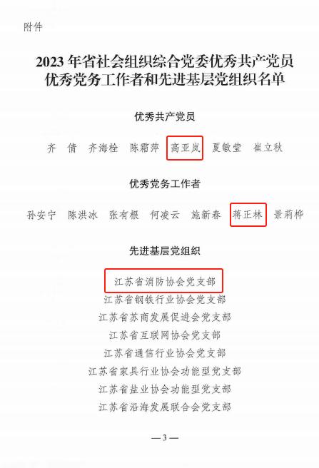 近日,中共江蘇省社會(huì )組織綜合委員會(huì )印發(fā)《關(guān)于表彰優(yōu)秀共產(chǎn)黨員優(yōu)秀黨務(wù)工作者和先進(jìn)基層黨組織的決定》,江蘇省消防協(xié)會(huì )黨支部榮獲“先進(jìn)基層黨組織”稱(chēng)號,協(xié)會(huì )黨支部書(shū)記、會(huì )長(cháng)蔣正林同志被授予“優(yōu)秀黨務(wù)工作者”稱(chēng)號,協(xié)會(huì )秘書(shū)高亞嵐同志被授予“優(yōu)秀共產(chǎn)黨員”稱(chēng)號。