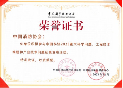 2024年2月26日,中國消防協(xié)會(huì )收到中國科學(xué)技術(shù)協(xié)會(huì )頒發(fā)的榮譽(yù)證書(shū),表彰我會(huì )積極參與中國科協(xié)2023重大科學(xué)問(wèn)題、工程技術(shù)難題和產(chǎn)業(yè)技術(shù)問(wèn)題的征集發(fā)布活動(dòng)。