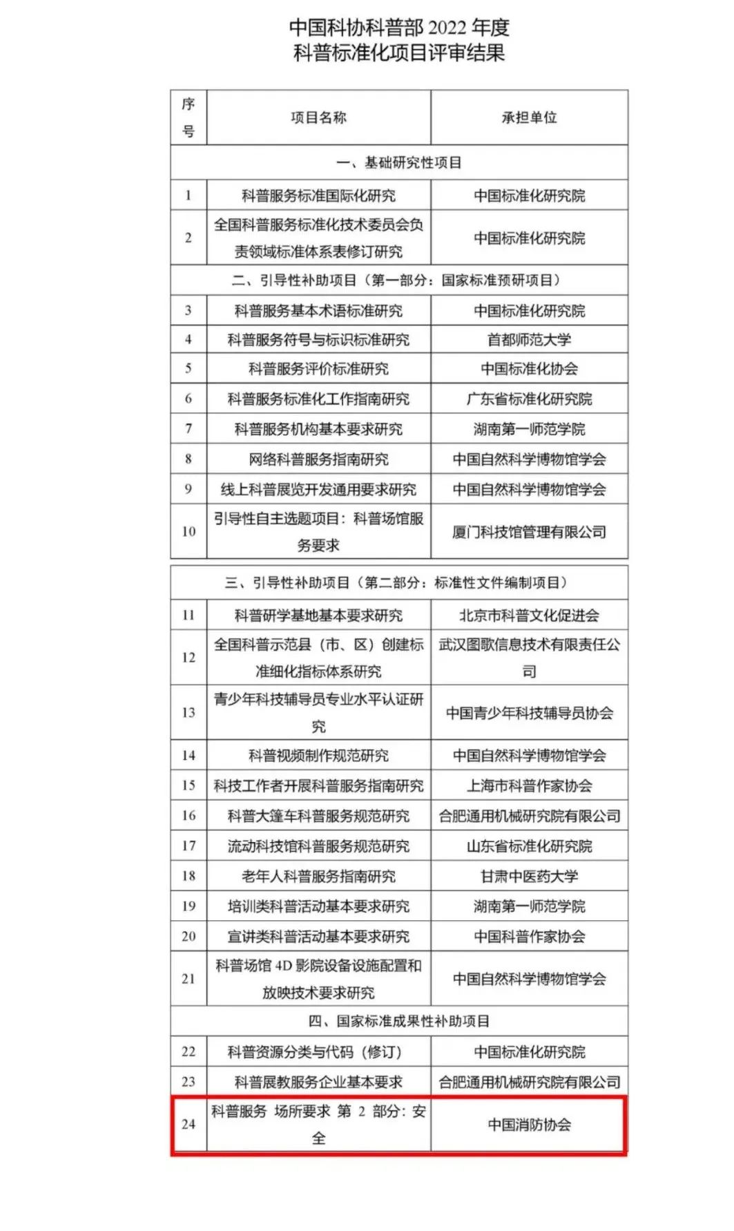 《中國科協(xié)科普部關(guān)于組織開(kāi)展2022年度科普標準化項目申報的通知》(科協(xié)普函礎字〔2022〕10號)發(fā)布后,我會(huì )認真組織項目申報。由中國消防協(xié)會(huì )科普教育工作委員會(huì )副主任兼秘書(shū)長(cháng)紀杰教授主持,申報了國家標準成果性補助項目“科普服務(wù) 場(chǎng)所要求 第2部分:安全”。經(jīng)中國科協(xié)資格審查、專(zhuān)家評審,該項目通過(guò)中國科協(xié)科普部2022年度科普標準化第一批項目承擔單位評審。
