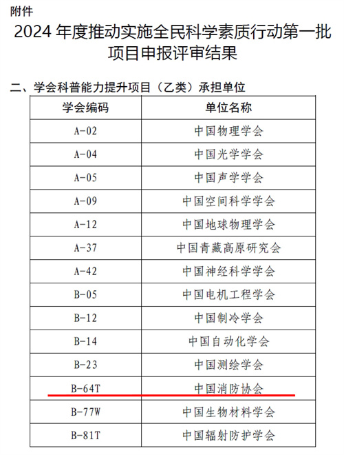 自《中國科協(xié)科普部關(guān)于組織實(shí)施2024年度推動(dòng)實(shí)施全民科學(xué)素質(zhì)行動(dòng)第一批項目申報評審的通知》(科協(xié)普函綜字〔2024〕13號)發(fā)布以來(lái),我會(huì )積極響應,精心籌備,項目由中國消防協(xié)會(huì )科普教育工作委員會(huì )副主任兼秘書(shū)長(cháng)紀杰教授主持。經(jīng)中國科協(xié)資格審查、專(zhuān)家評審,此次有15家申報單位承擔甲類(lèi)項目,我會(huì )與其他49家學(xué)會(huì )承擔乙類(lèi)項目。我會(huì )將充分發(fā)揮自身專(zhuān)業(yè)優(yōu)勢,切實(shí)做好項目落實(shí)工作,確保項目取得實(shí)效。