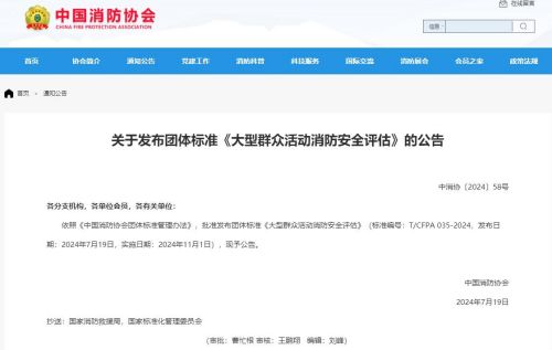 近期,中國消防協(xié)會(huì )發(fā)布公告(中消協(xié)〔2024〕58號),團體標準《大型群眾性活動(dòng)消防安全評估》(標準編號:T/CFPA 035-2024),已于2024年7月19日正式發(fā)布,將于2024年11月1日正式實(shí)施。