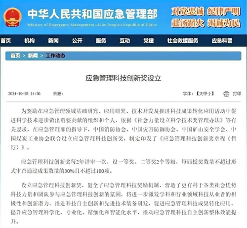 2024年10月28日,應急管理部網(wǎng)站發(fā)布新聞,在應急管理部的指導下,中國消防協(xié)會(huì )、中國災害防御協(xié)會(huì )、中國礦山安全學(xué)會(huì )、中國煤炭工業(yè)協(xié)會(huì )聯(lián)合設立應急管理科技創(chuàng )新獎,制定印發(fā)了《應急管理科技創(chuàng )新獎?wù)鲁蹋〞盒校贰?/p>