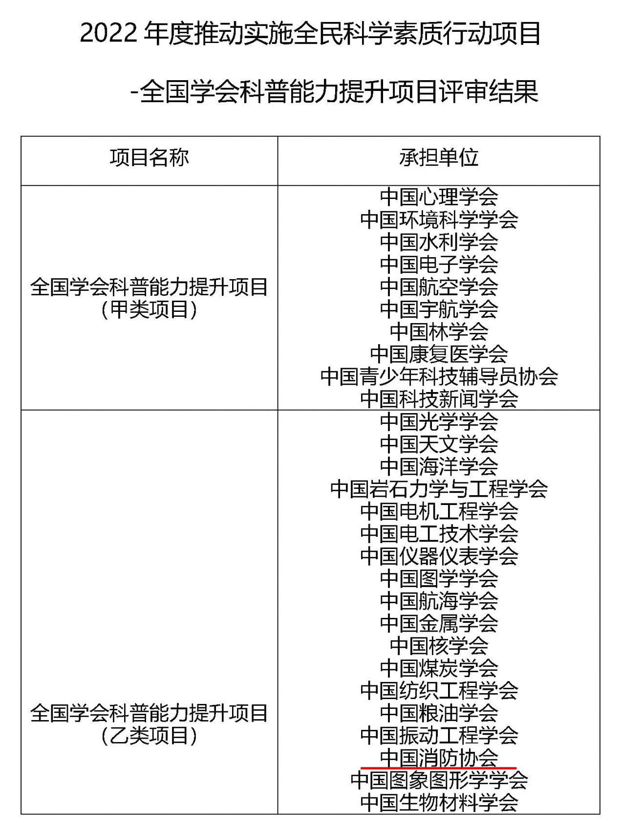 7月13日,中國科協(xié)官網(wǎng)發(fā)布《關(guān)于2022年度推動(dòng)實(shí)施全民科學(xué)素質(zhì)行動(dòng)項目-全國學(xué)會(huì )科普能力提升項目評審結果的公示》,我會(huì )成功獲批承擔乙類(lèi)項目。自《中國科協(xié)科普部關(guān)于組織實(shí)施2022年度推動(dòng)實(shí)施全民科學(xué)素質(zhì)行動(dòng)項目—學(xué)會(huì )科普能力提升項目申報評審的通知》發(fā)布以來(lái),我會(huì )積極參與,認真組織申報,項目由中國消防協(xié)會(huì )科普教育工作委員會(huì )副主任兼秘書(shū)長(cháng)紀杰教授主持。經(jīng)中國科協(xié)資格審查、專(zhuān)家評審,此次有10家申報單位承擔甲類(lèi)項目,我會(huì )與其他29家學(xué)會(huì )承擔乙類(lèi)項目。未來(lái)我會(huì )將充分發(fā)揮自身專(zhuān)業(yè)優(yōu)勢,切實(shí)做好項目落實(shí)工作,確保項目取得實(shí)效。