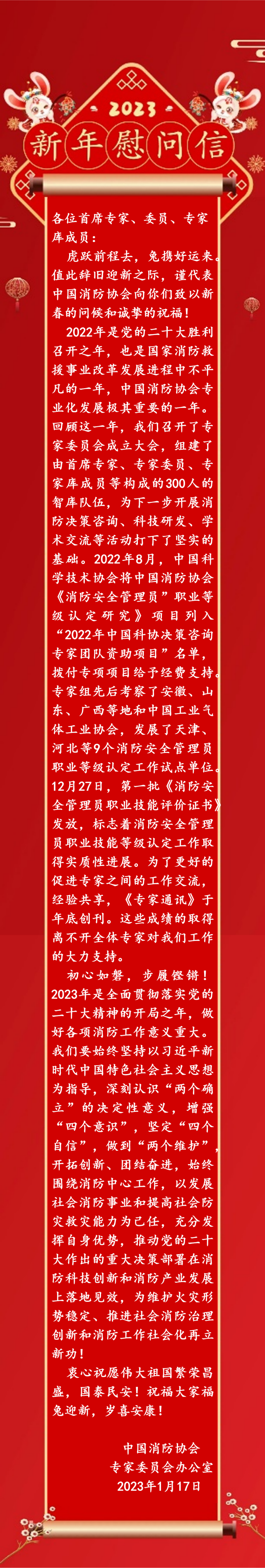 新春佳節來(lái)臨之際,中國消防協(xié)會(huì )向專(zhuān)家委員會(huì )全體專(zhuān)家發(fā)出慰問(wèn)信,致以節日問(wèn)候和誠摯祝福。